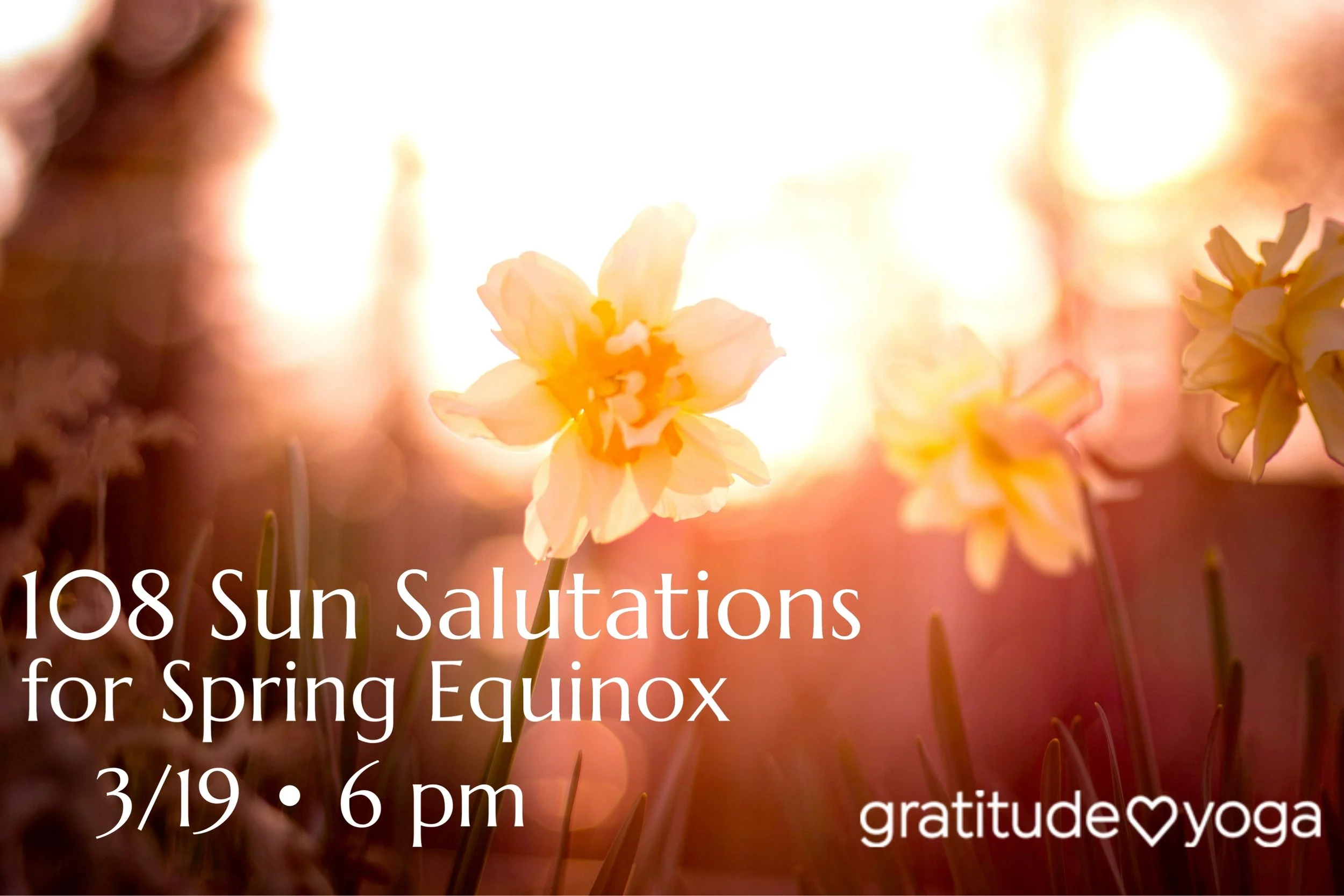 Join our Gratitude Yoga teachers as we take turns leading a heart expanding practice of 108 Sun Salutations for Spring Equinox and welcome growth and possibility. Rest and modifications are encouraged.